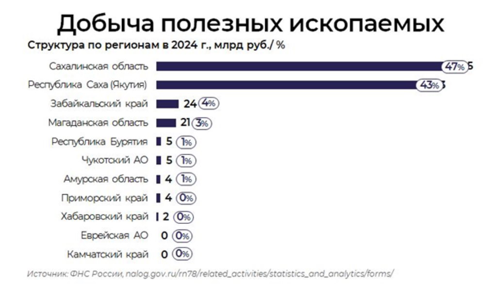 Несмотря на то, что добывающая отрасль обеспечивает 30% валового регионального продукта ДФО, по численности занятых она занимает лишь восьмое место с долей 6%. Это означает, что отрасль в основном формирует налоговые доходы федерального бюджета, а ее влияние на НДФЛ остается менее значимым, даже при уровне заработных плат выше среднего по экономике. Основной объем налогов добывающего сектора (90%) сосредоточен в Сахалинской области и Республике Саха (Якутия), что делает эти регионы особенно уязвимыми к внешним экономическим шокам.