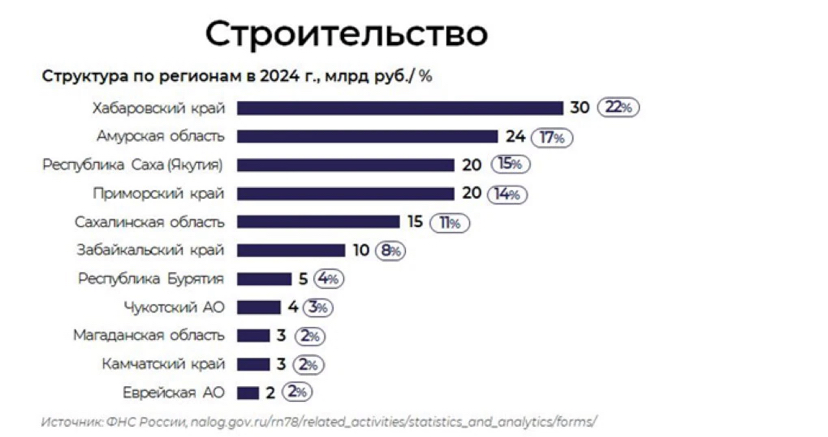 По итогам 2024 года общий объем налоговых доходов Дальневосточного федерального округа составил 1,7 триллиона рублей, что соответствует 4% от общероссийского показателя. Лидером по налоговым поступлениям стала добывающая промышленность, которая обеспечивает 39% всех налоговых доходов.