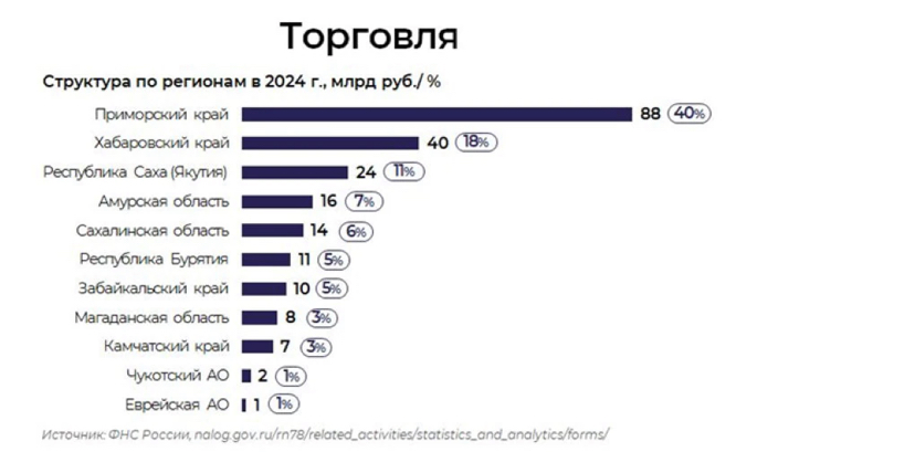 По итогам 2024 года общий объем налоговых доходов Дальневосточного федерального округа составил 1,7 триллиона рублей, что соответствует 4% от общероссийского показателя. Лидером по налоговым поступлениям стала добывающая промышленность, которая обеспечивает 39% всех налоговых доходов.