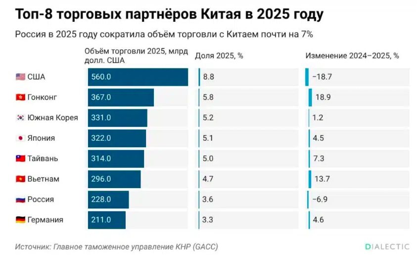 В числе ключевых внешнеторговых партнёров Китая Россия находится на седьмой строчке — 3,6% от совокупного китайского оборота. Ну а главным торговым контрагентом Поднебесной остаются Соединённые Штаты с оборотом почти в 560 млрд долларов и долей 8,8% в общем объёме сделок. В топе партнёров также — страны Юго-Восточной Азии.