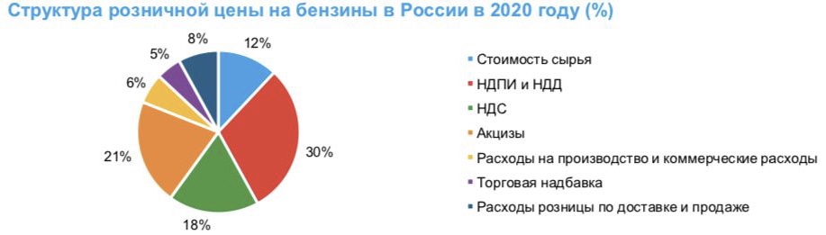 Чтобы разобраться с высокой стоимостью бензина, остановимся подробнее на ценообразовании топлива. В России цены на бензин и дизельное топливо не привязаны к котировкам на нефть напрямую. Фактически их регулирует государство. 74% стоимости одного литра бензина на АЗС - это акциз на топливо, НДС, налог на добычу полезных ископаемых, расходы нефтеперерабатывающих заводов на переработку и транспортировку топлива. И надбавки АЗС, которые закупают топливо на оптовом рынке, а затем пытаются получить дополнительную прибыль с продажи. Что тоже понятно.